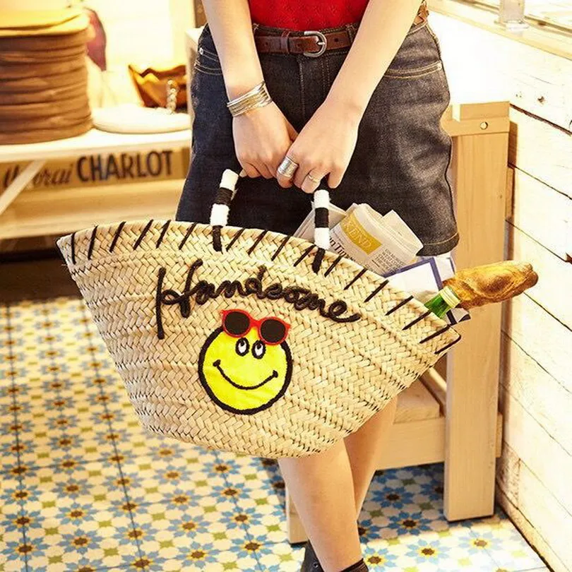 البحث عن معلوماتمعلومات اضافية 2019 الصيف Smlie حقيبة تسوق اليدوية حقيبة شاطئية نسج الأعلى مقبض حقائب السيدات جولة القش حقيبة القمر على شكل ملفوفة حقيبة بولسا