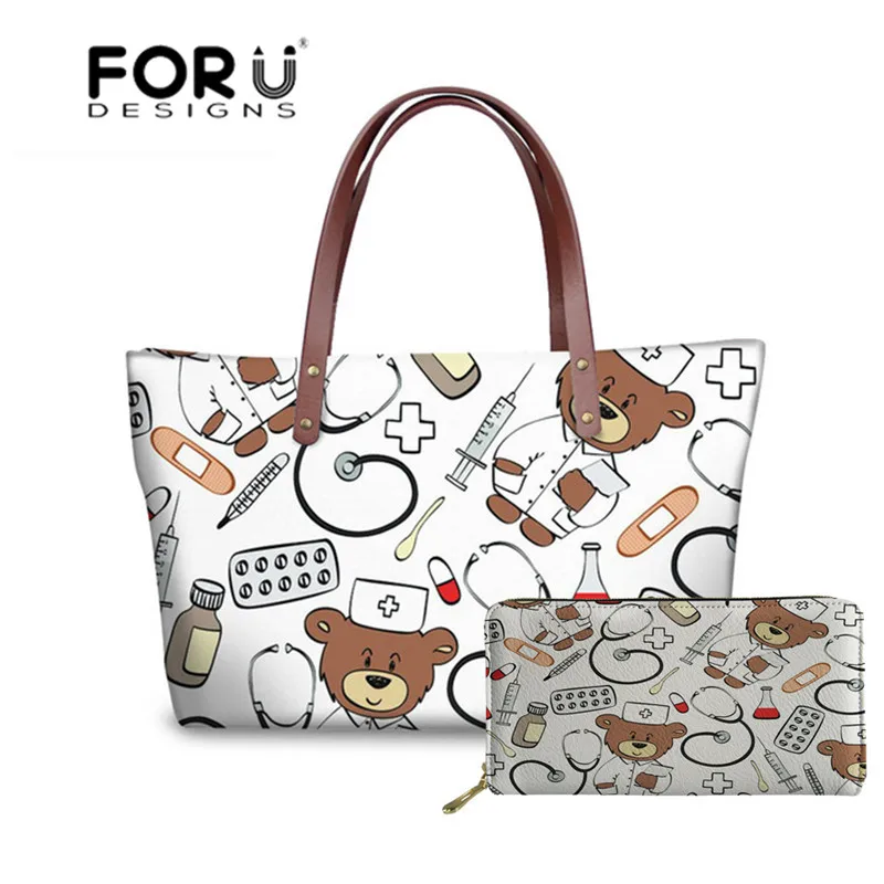 معرض من FORUDESIGNS أعلى-حقائب بيد الكرتون لطيف ممرضة الدب الطباعة المرأة حقيبة يد كبيرة قدرة عارضة حمل الإناث حقيبة كتف فتاة