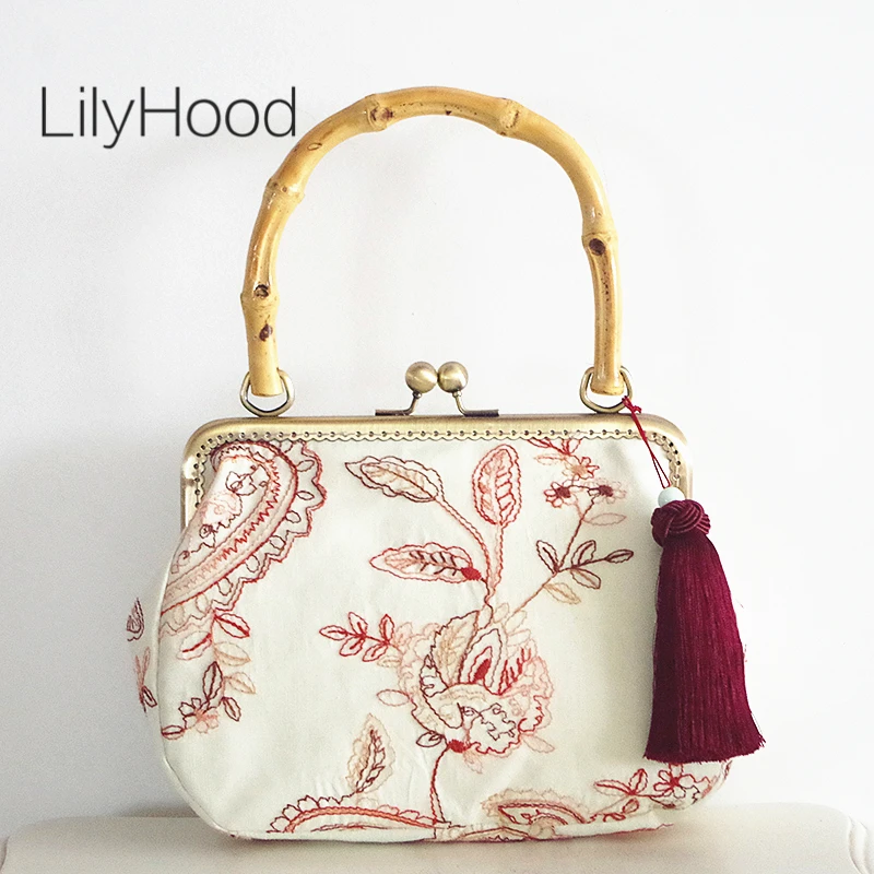 شراءمعلومات اضافية LilyHood الحرفية الخيزران أعلى-حقائب بيد الإناث الرجعية شيك الزهور التطريز نسيج صيني هامش Crossbody حقيبة للنساء