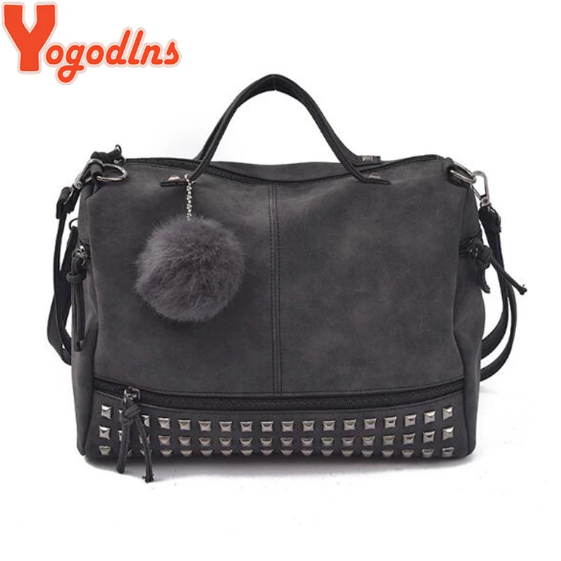 معرض من Yogodlns خمر Nubuck حقيبة يد من الجلد للنساء برشام أكياس كبيرة الشعر الكرة النساء حقيبة كتف دراجة نارية رسول الأعلى مقبض حقيبة