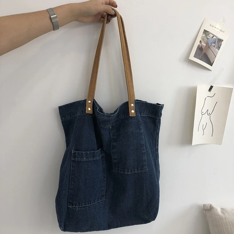 استعارات من النساء الدنيم حمل حقيبة عارضة الترفيه الأعلى مقبض حقيبة جان حقيبة يد من القماش للنساء Famale مفتوحة الكورية أزياء الشارع نمط حقيبة